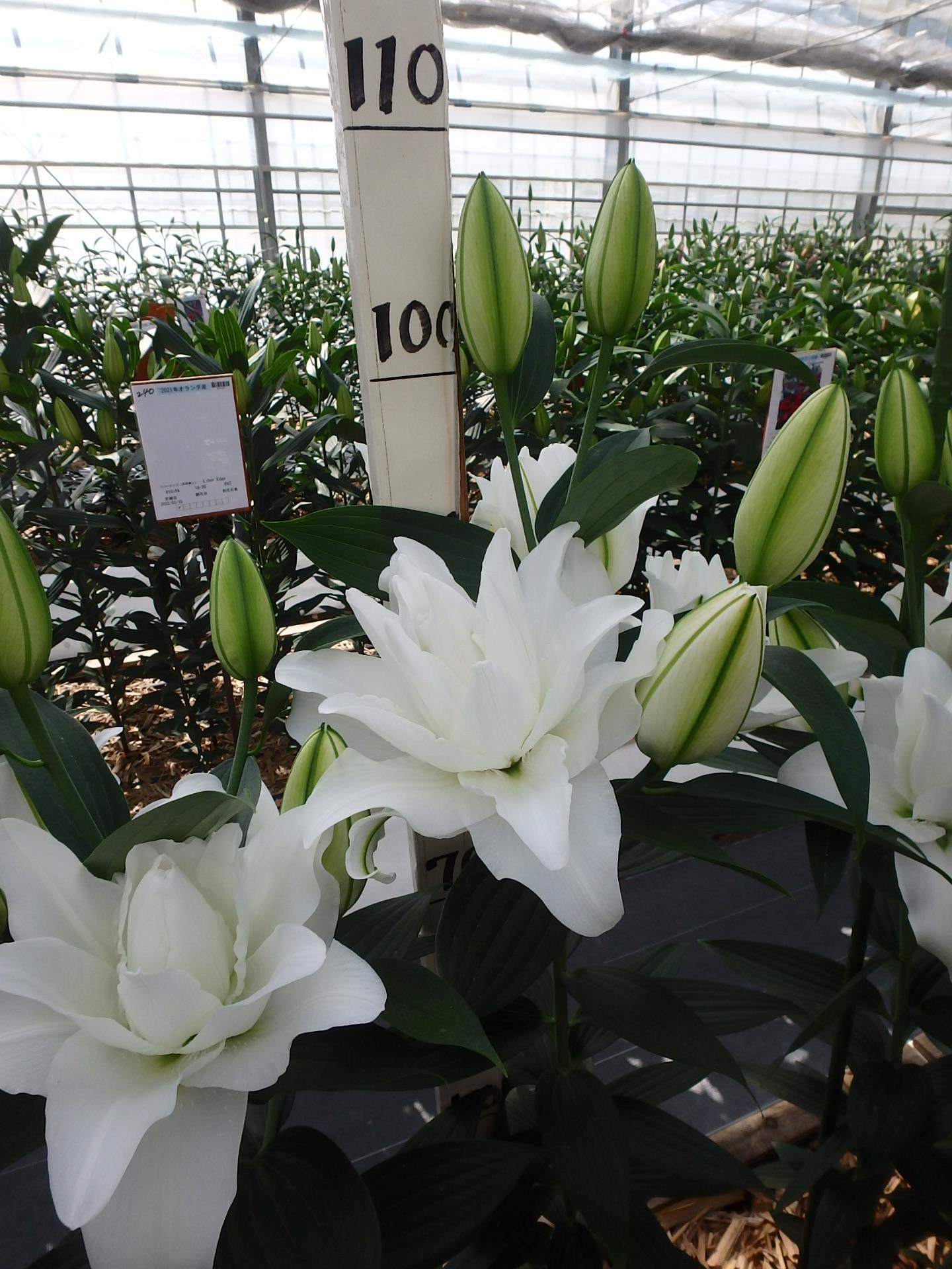 2021年NL産 促成試験 OT/八重 部屋6 シャルドネ(八重) 2022/3/31 2022/4/14 2022/4/28 2022/6/2 2022/6/6 産地 オランダ 品名 シャルドネ(八重) 英語名 Chardonnay サイズ 14-16 リン数 最小 3 リン数 最多 8 草丈 105 到花日数 中生 色 白 交配系統 オリエンタル 定植日 2022/3/1 開花日 2022/6/3 花直径 22 蕾大きさ 11 枝長 11