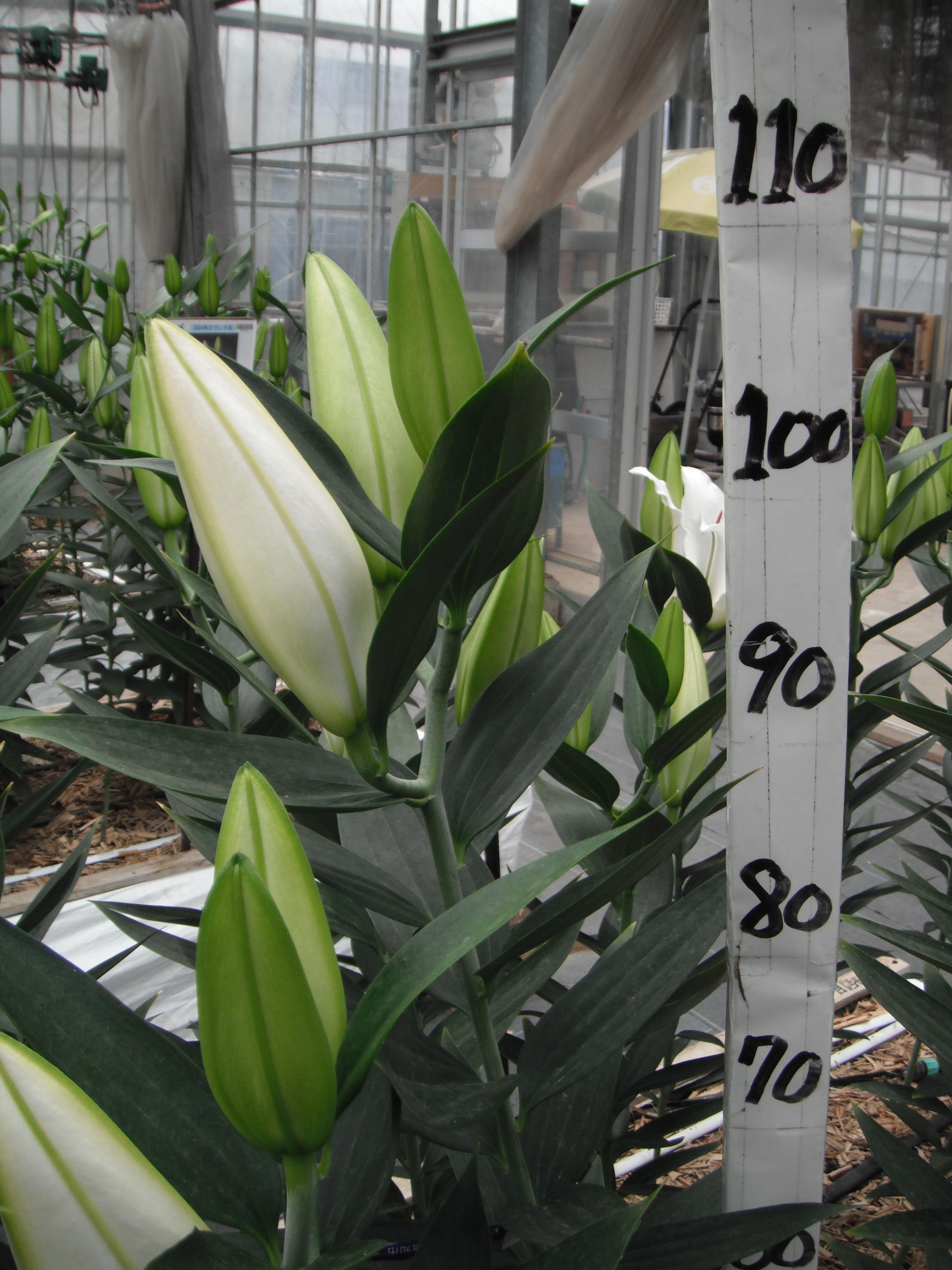 2024年NL産 促成試験 鉄/PotOR/OR 部屋4 ホワイトパッション 2025/4/15 2025/4/21 2025/5/8 2025/6/11 2025/6/13 産地 オランダ 品名 ホワイトパッション 英語名 White Passion サイズ 16-18 リン数 最小 2 リン数 最多 4 草丈 100 到花日数 晩生 色 白 交配系統 オリエンタル 定植日 2025/3/11 開花日 2025/6/11 花直径 26 蕾大きさ 18 枝長 5