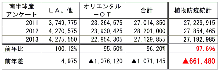 植物防疫統計によると、13年南半球産の輸入実績は合計27,192,985球でした。