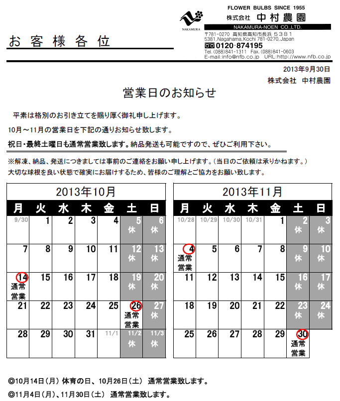 営業日のお知らせ(2013/11/28)