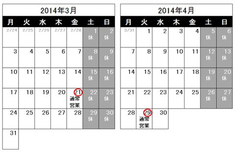 平素は格別のお引き立てを賜り厚く御礼申し上げます。 2014年3月~4月の営業日を下記の通りお知らせ致します。...