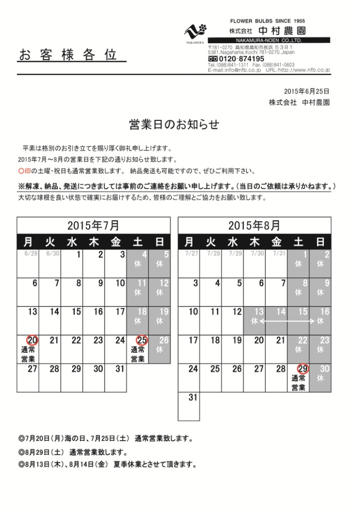 平素は格別のお引き立てを賜り厚く御礼申し上げます。 2018年7月~8月の営業日を下記の通りお知らせ致します。...