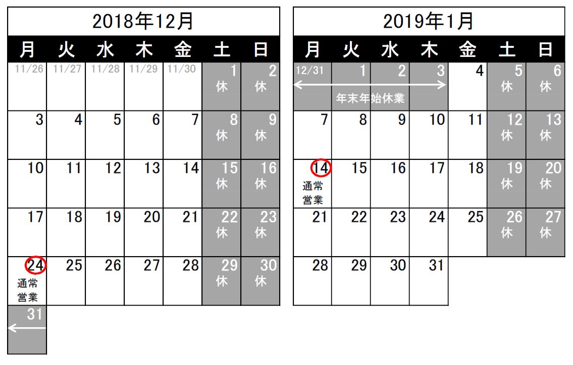 平素は格別のお引き立てを賜り厚く御礼申し上げます。 2018年12月~2019年1月の営業日を下記の通りお知ら...